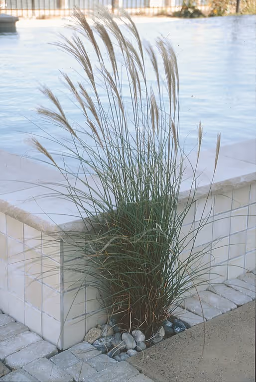 The pool is relatively small, just 12 by 30 feet with no spa and a very clean and simple rectangular design. It has raised beams that create seating areas topped by poured-in-place coping with a willow-green broom finish. There’s also a fully equipped outdoor kitchen/bar area with granite countertops and handmade tile that matches the pool.