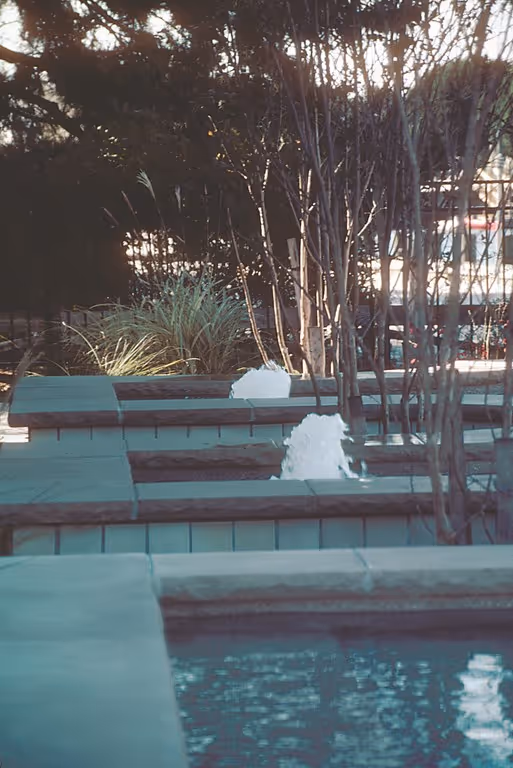 The interior of the pool is a soft green plaster (a color selection we believe is a first in this part of New Jersey), complemented by an ultra-elegant, hand-made, cream-colored porcelain tile. The color palette is very soft and natural, which adds a measure of warmth to an otherwise edgy modern design.