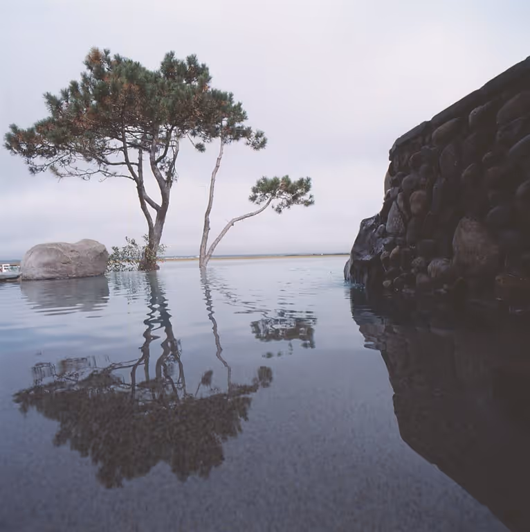 The vanishing edge spills into a water-on-water view, and the whole composition has a bay-front camp feeling – informal, but truly elegant and understated in keeping with its surroundings.
