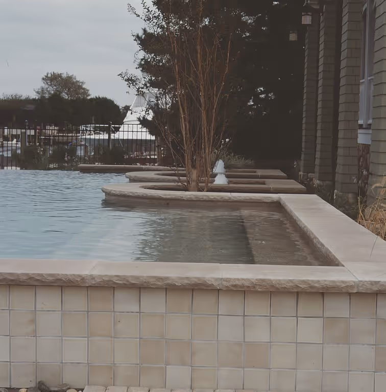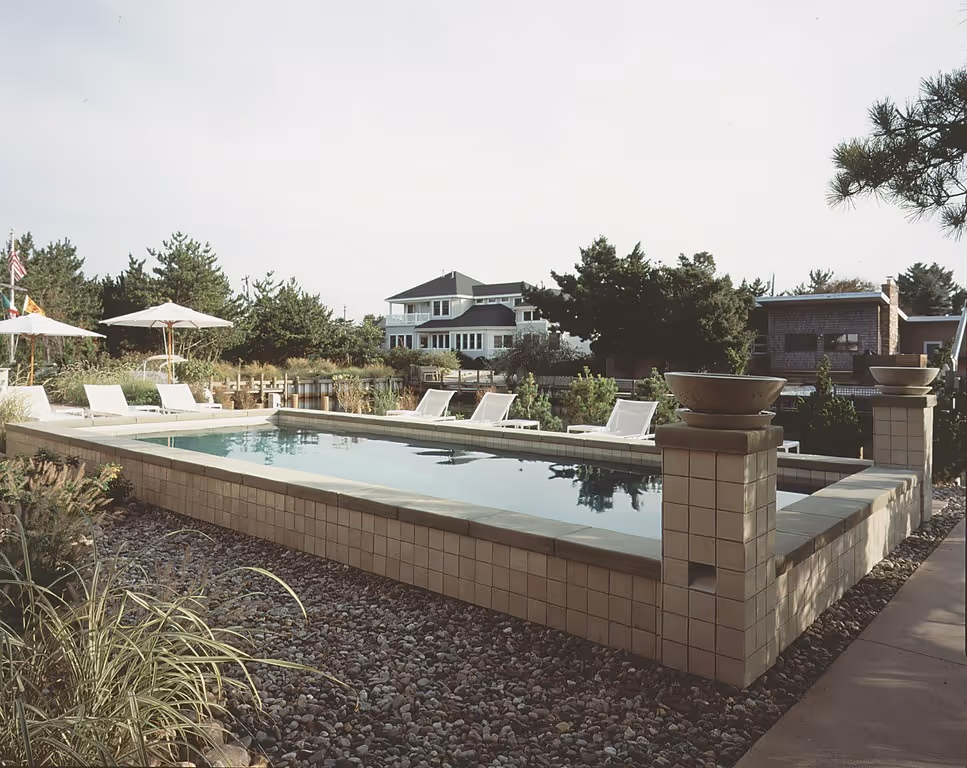 This project was completed on Long Beach Island, N.J., in conjunction with a teardown project directed by local architect Bill Tagland and builder Patrick Moeller. We were brought in after the owner had already acquired a proposal from a volume pool builder. To say that the design on the table was inadequate to the stunning Mediterranean architecture of the remodeled home would be a gross understatement.