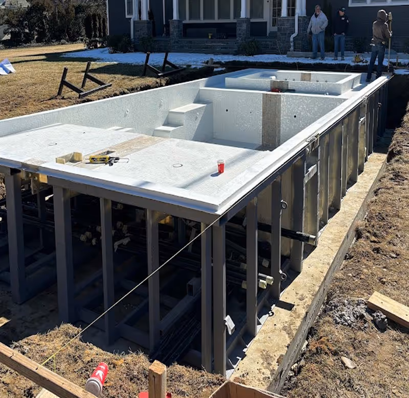 The prefab concept changes that problematic equation. The saved steps include wood framing, rough plumbing, electric stub out, steel rebar, gunite/shotcrete, dampening/curing concrete, waterproofing, tiling the waterline or entire pool, and a simplified start up process. Each of those phases involves elements of risk where things can, and sometimes do, go wrong.