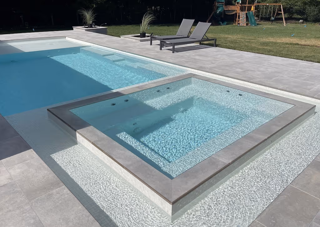 Every pool is built to custom specifications — not limited to pre-designed molds — so, no two are exactly the same. They are all pre-plumbed and every vessel has a mosaic, all glass-tile finish.