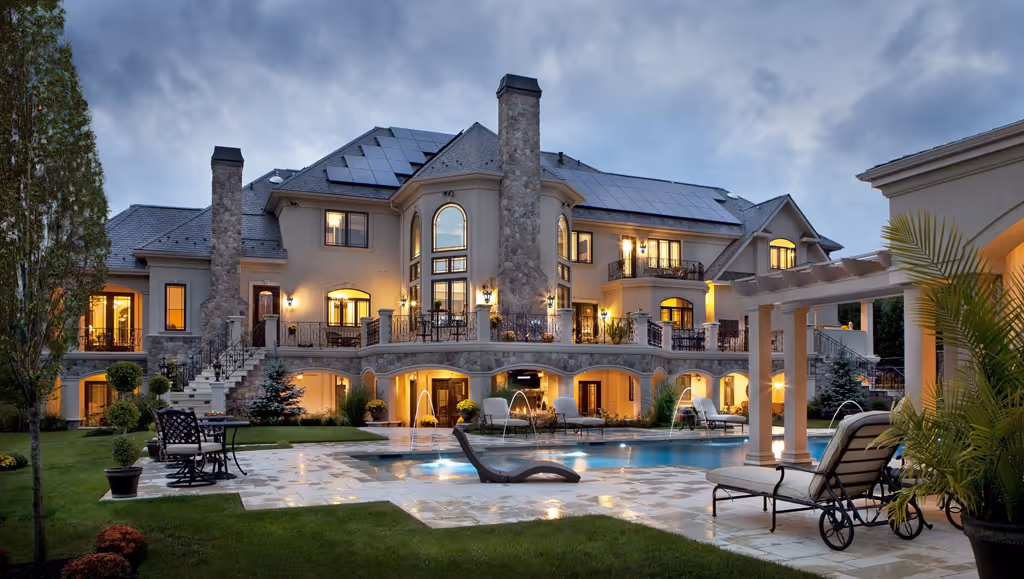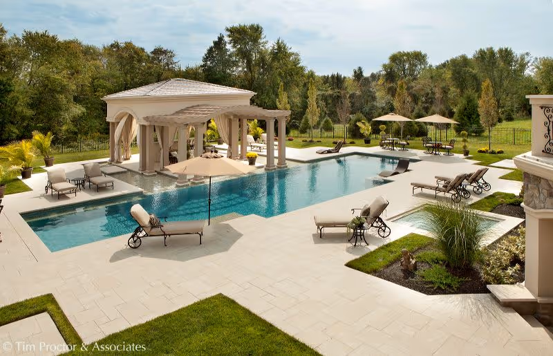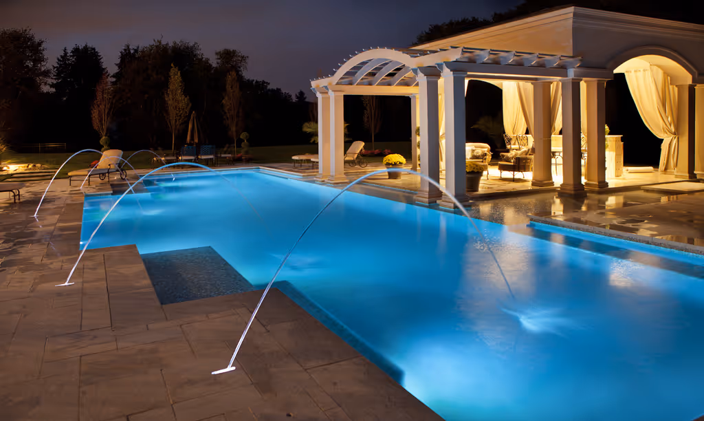 This outdoor retreat blends luxury with imagination, designed to feel both elegant and playfully unexpected. At its heard, the pool stretches beneath a striking Piazza Portico that appears to float on the water’s surface, becoming a dramatic and sculptural focal point. A separate spa, positioned as its own intimate destination, remains visually connected to the pool through a continuous palette of custom-blended glass mosaic tile from Murano, Italy and decking in refined Egyptian marble. This thoughtful arrangement creates harmony between separation and unity – each element distinct, yet woven together through material and design. Enhancing the experience, laminar jets arc across the water in perfect symmetry, their glass-like streams catching the light and adding movement, reflection and a touch of whimsy to the serene landscape.