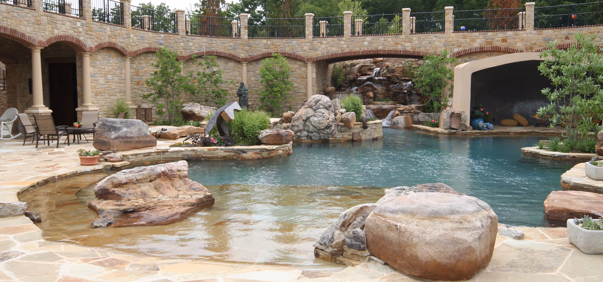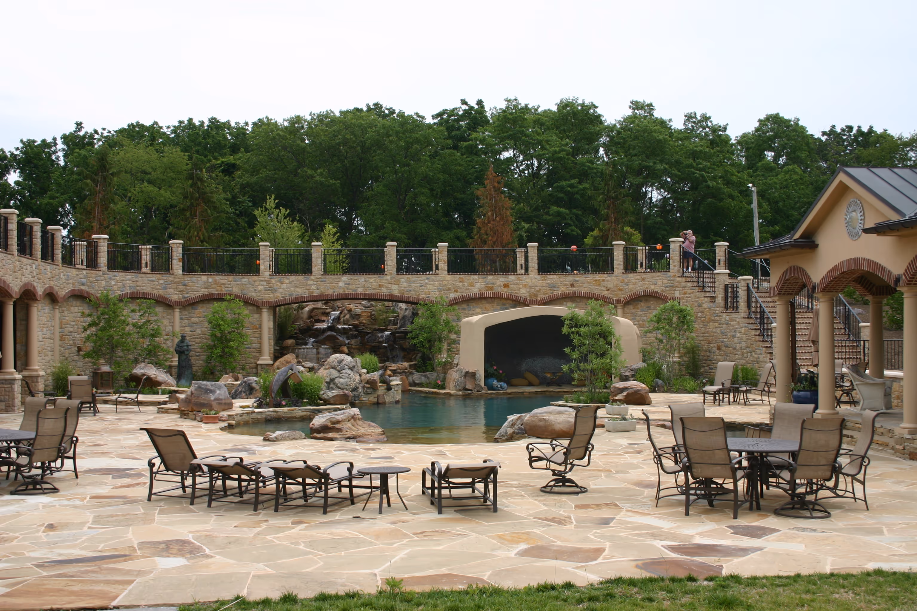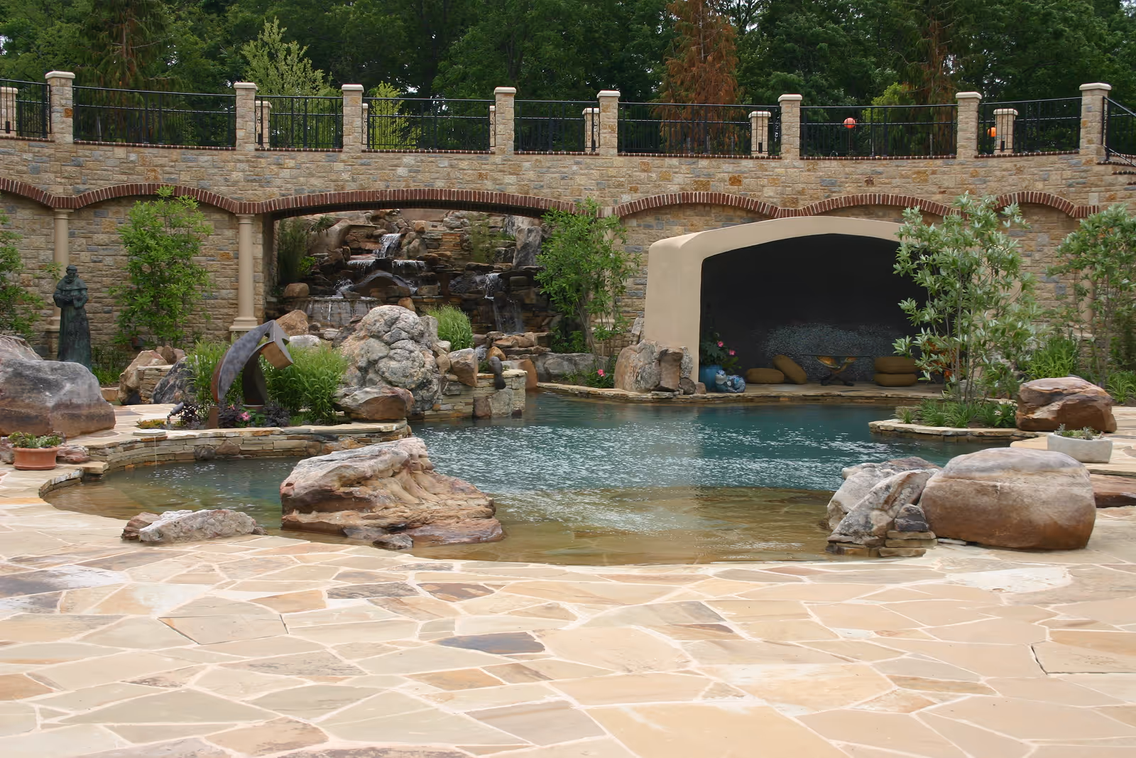 An organic deck of natural stone flows gracefully around the pool’s edge, weaving together intimate spaces for gathering and relaxation. Massive boulders and rugged rock formations anchor the design, while a waterfall tucked beneath an arched bridge gives the illusion that a nearby stream spills directly into the pool. Beyond the water, an amphitheater carved into the landscape creates a stage for live band performances—transforming the setting into an immersive outdoor venue. A raised island spa, finished in ledger-stone veneer and reached by natural-stone steps, adds both drama and intimacy. The result is a backyard retreat that blurs the boundary between natural landscape and crafted design—a destination where water, stone, and sound converge in perfect harmony.