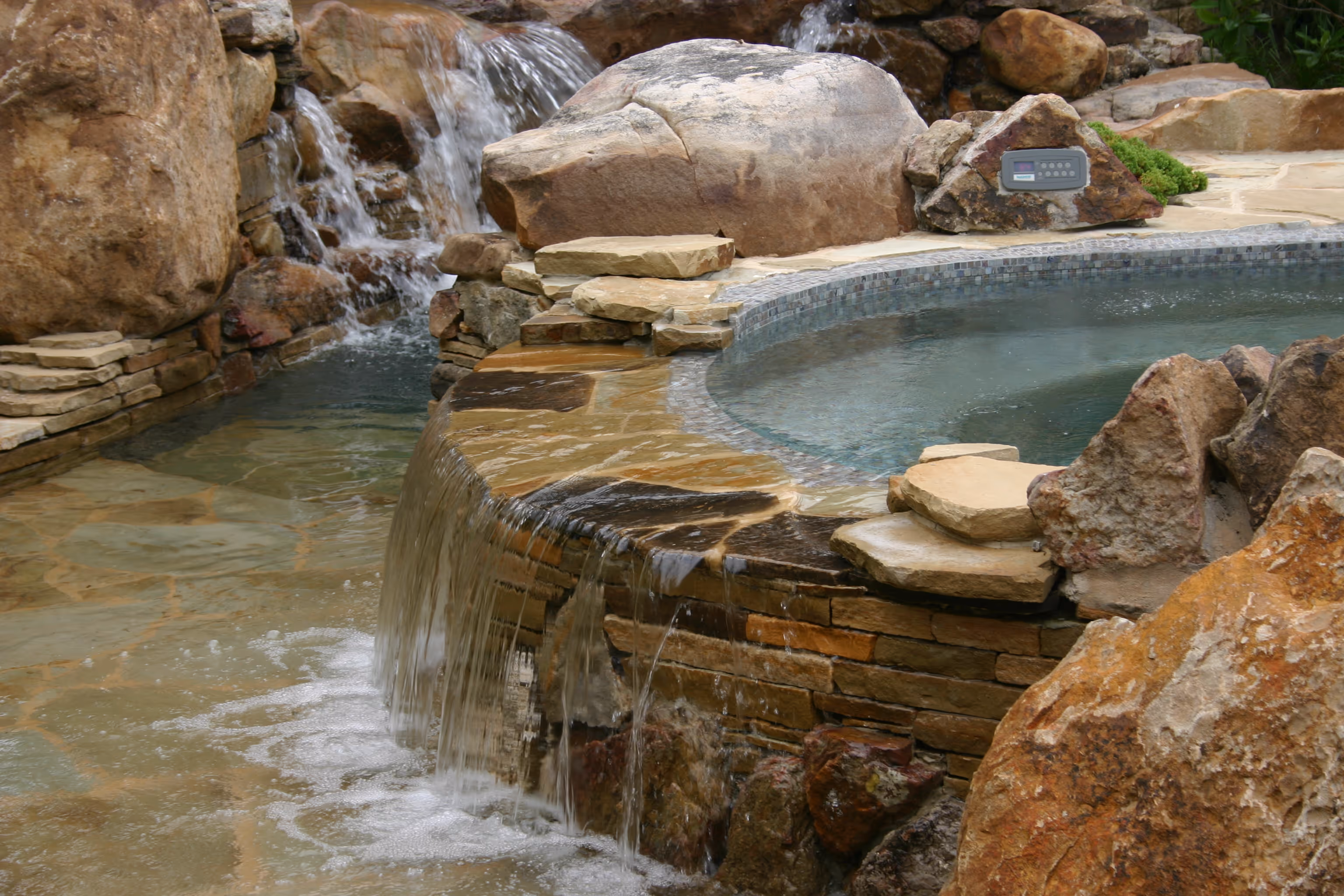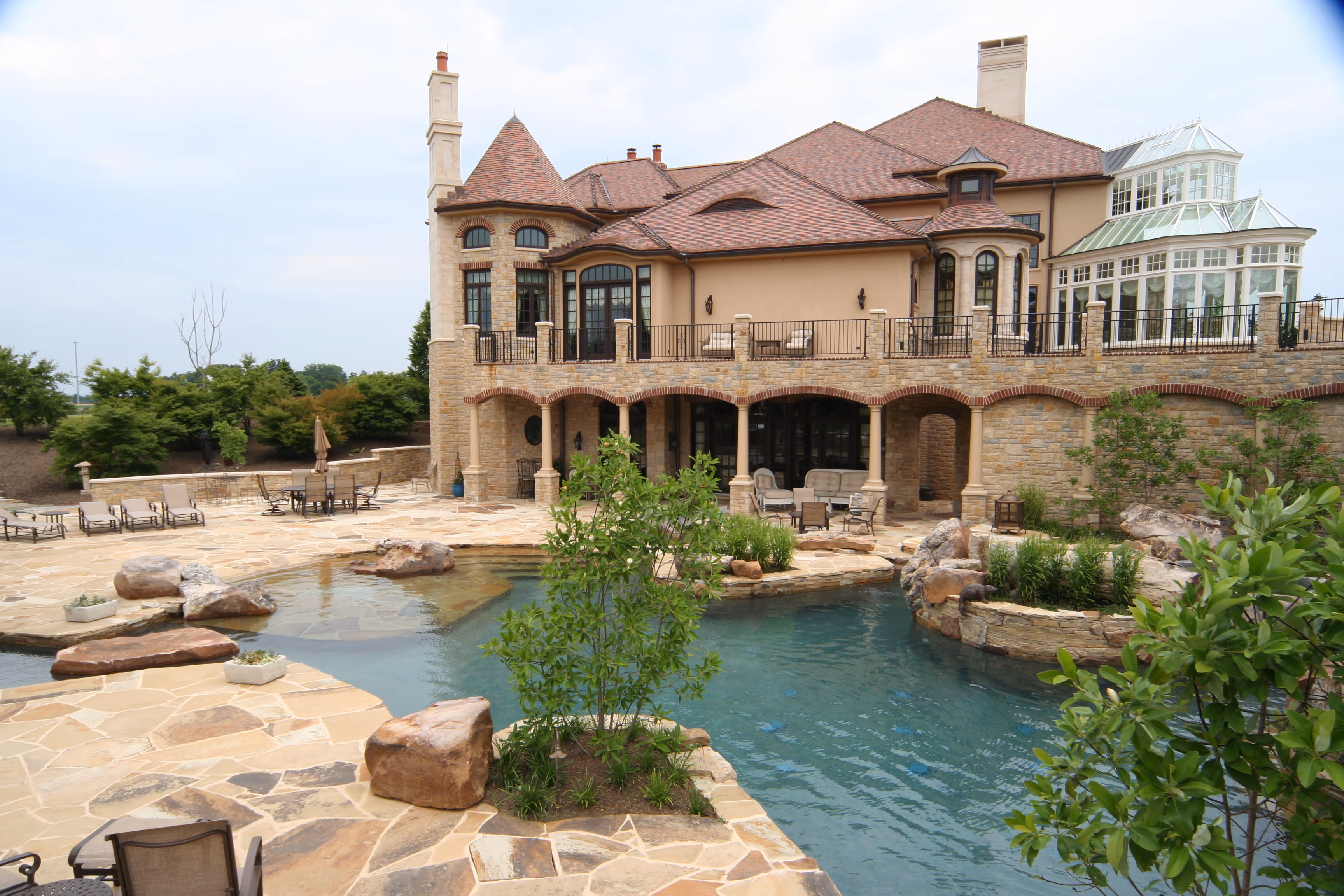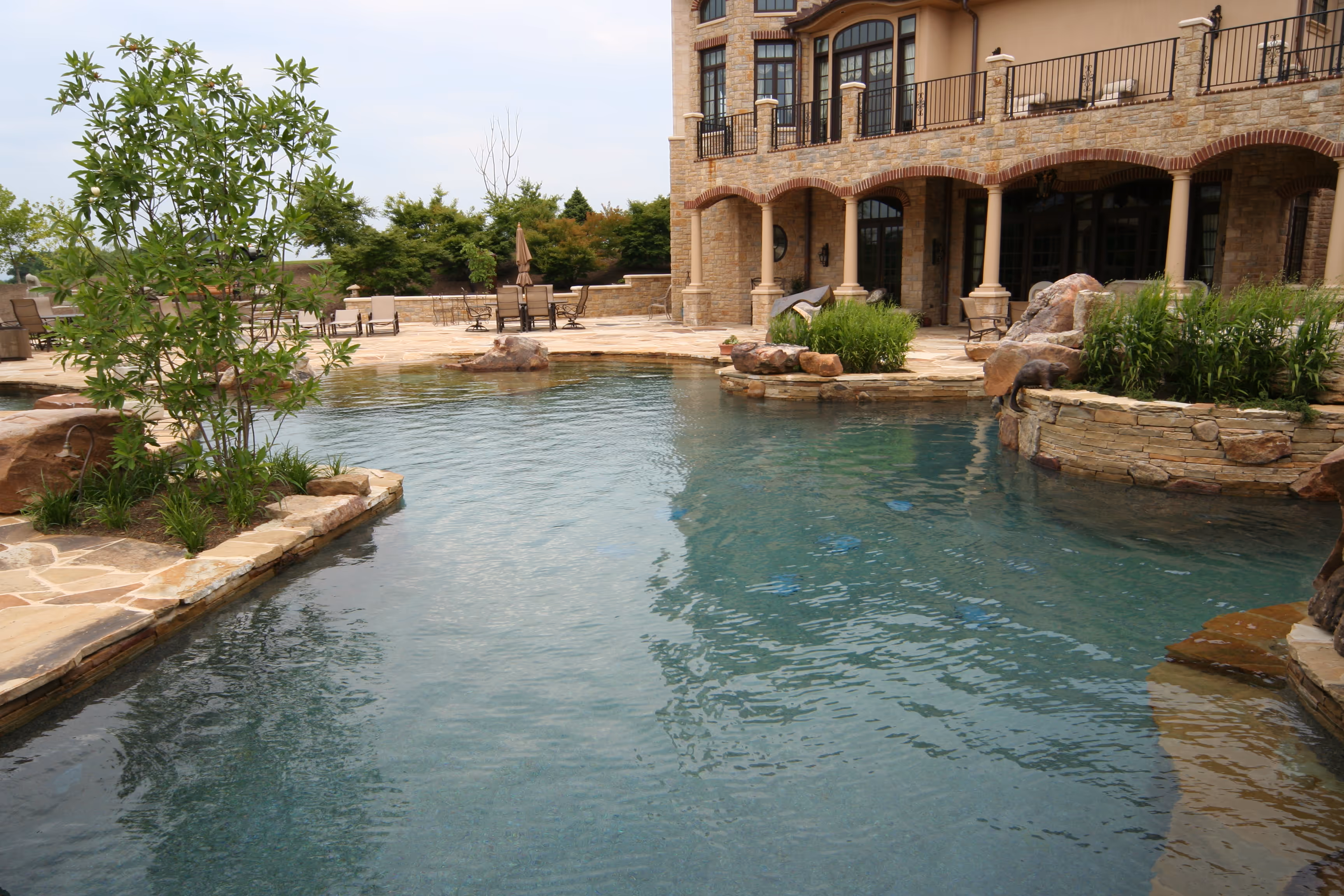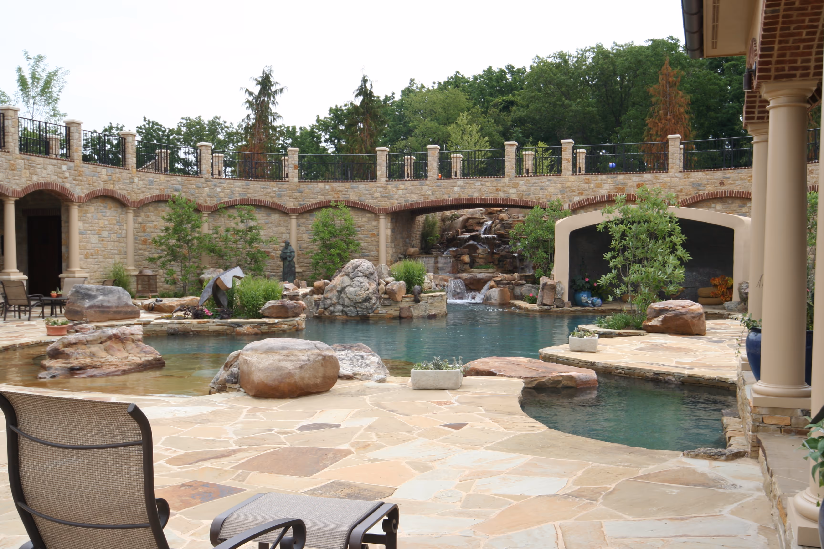 An organic deck of natural stone flows gracefully around the pool’s edge, weaving together intimate spaces for gathering and relaxation. Massive boulders and rugged rock formations anchor the design, while a waterfall tucked beneath an arched bridge gives the illusion that a nearby stream spills directly into the pool. Beyond the water, an amphitheater carved into the landscape creates a stage for live band performances—transforming the setting into an immersive outdoor venue. A raised island spa, finished in ledger-stone veneer and reached by natural-stone steps, adds both drama and intimacy. The result is a backyard retreat that blurs the boundary between natural landscape and crafted design—a destination where water, stone, and sound converge in perfect harmony.