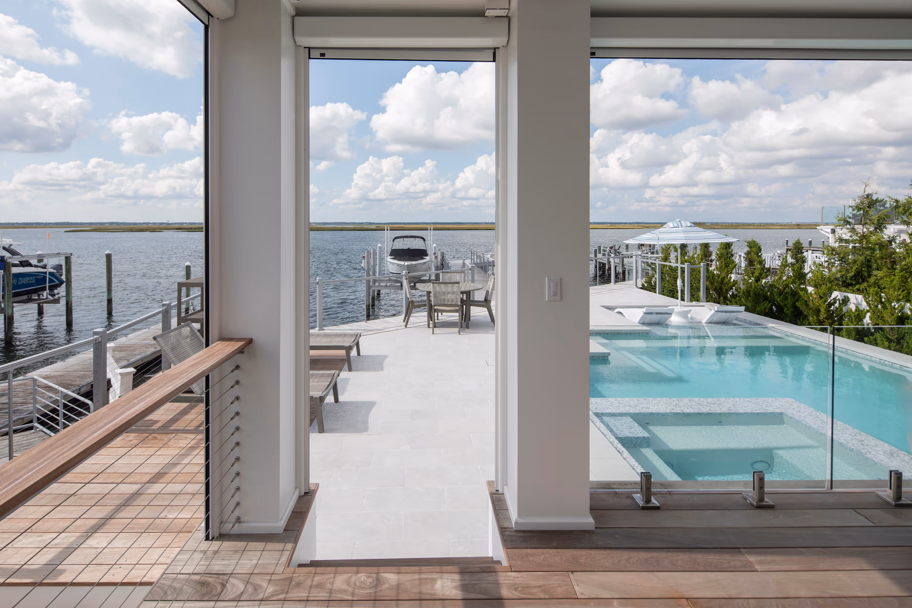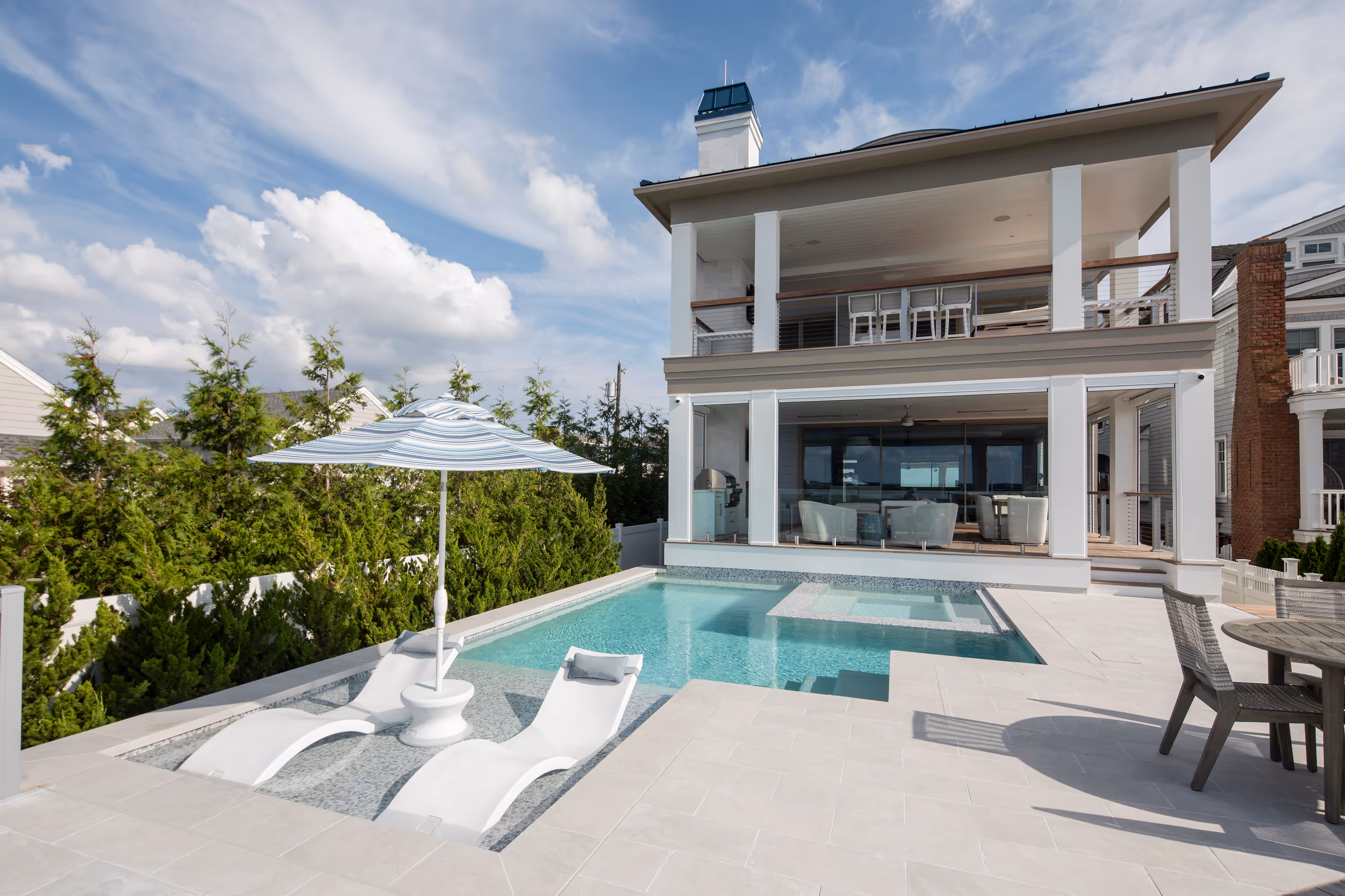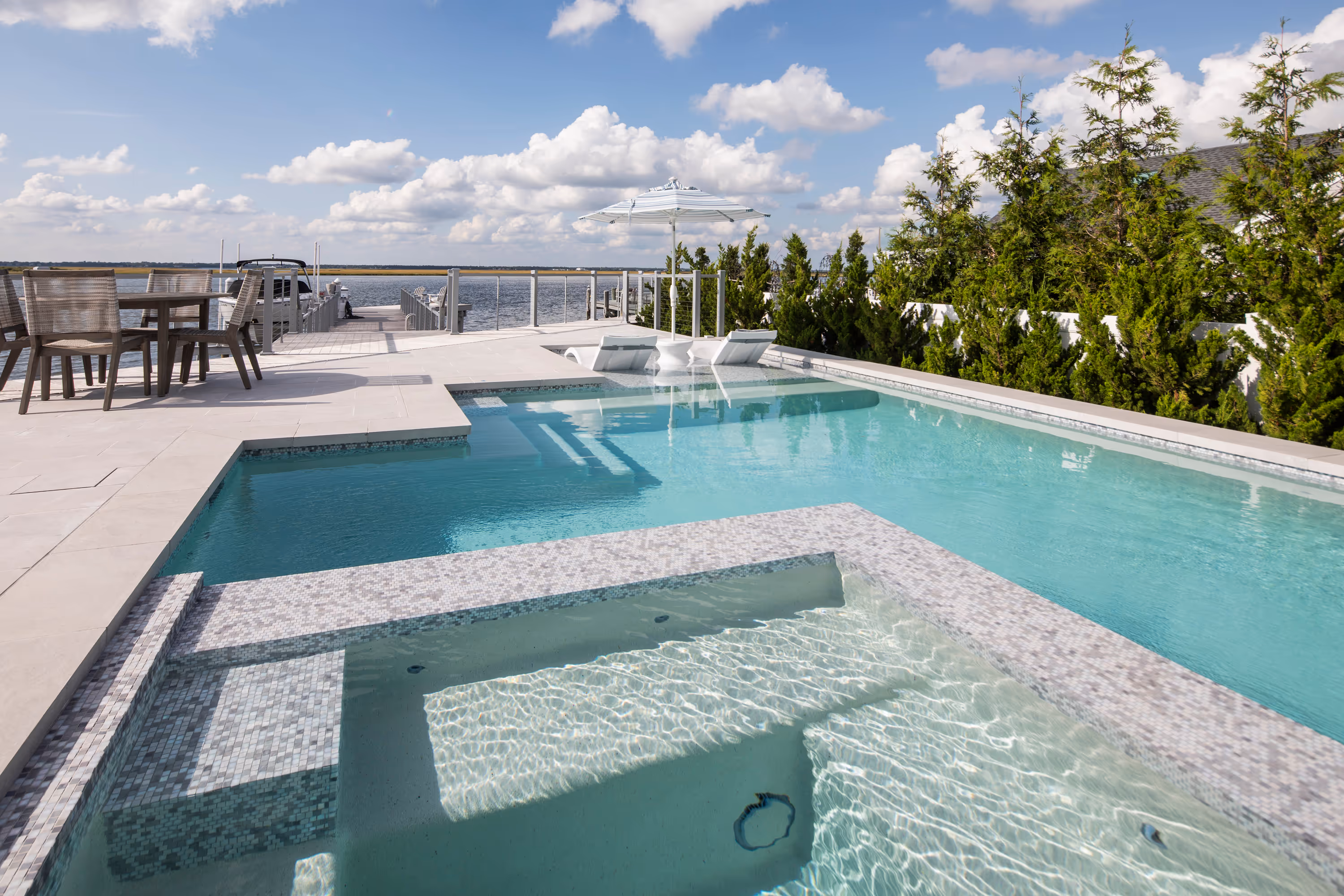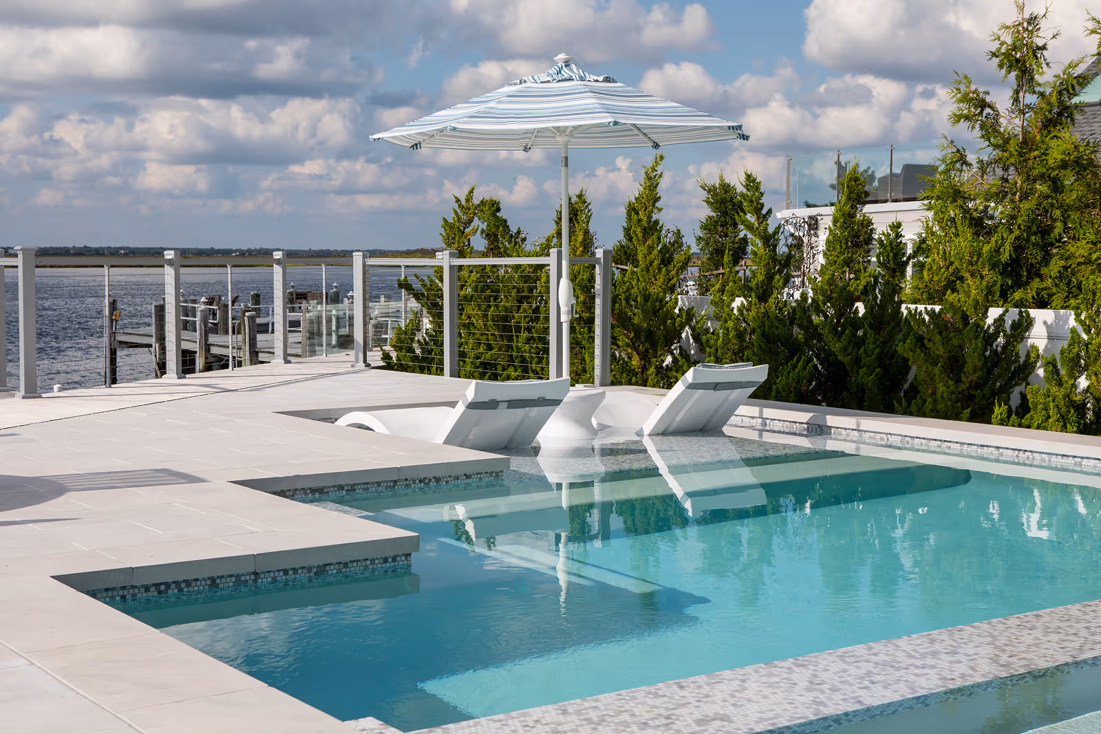 This elegant bayfront pool captures the essence of coastal serenity while embracing modern sophistication. Finished in custom-blended Italian glass tile, the water takes on a timeless, glass-lie surface that echoes the soft, airy tones of the home. A spacious thermal ledge offers a tranquil shallow retreat with unobstructed panoramic view of the bay, blurring the boundary between land, water and sky. The spa is fully integrated and perfectly flush with the pool, enhancing the reflective quality of the water and creating a seamless visual plane. This design not only elevates the aesthetic but also strengthens the sense of continuity – water flows uninterrupted, mirroring the horizon. Carefully aligned with the home’s shared wall, the pool becomes an extension of the architecture itself. Structure and water are united in both form and function, achieving a harmonious balance where clean geometry, materials and sightlines converge. The result is a space that feels purposefully connected – architecturally grounded, visually fluid and effortlessly serene.