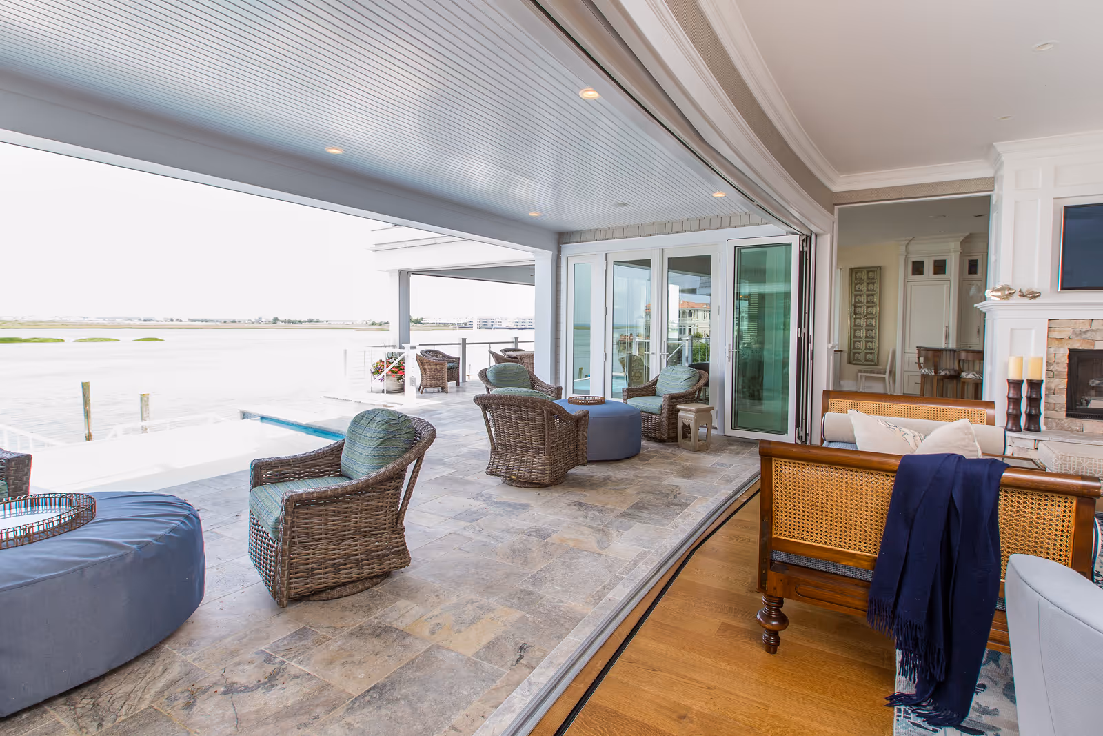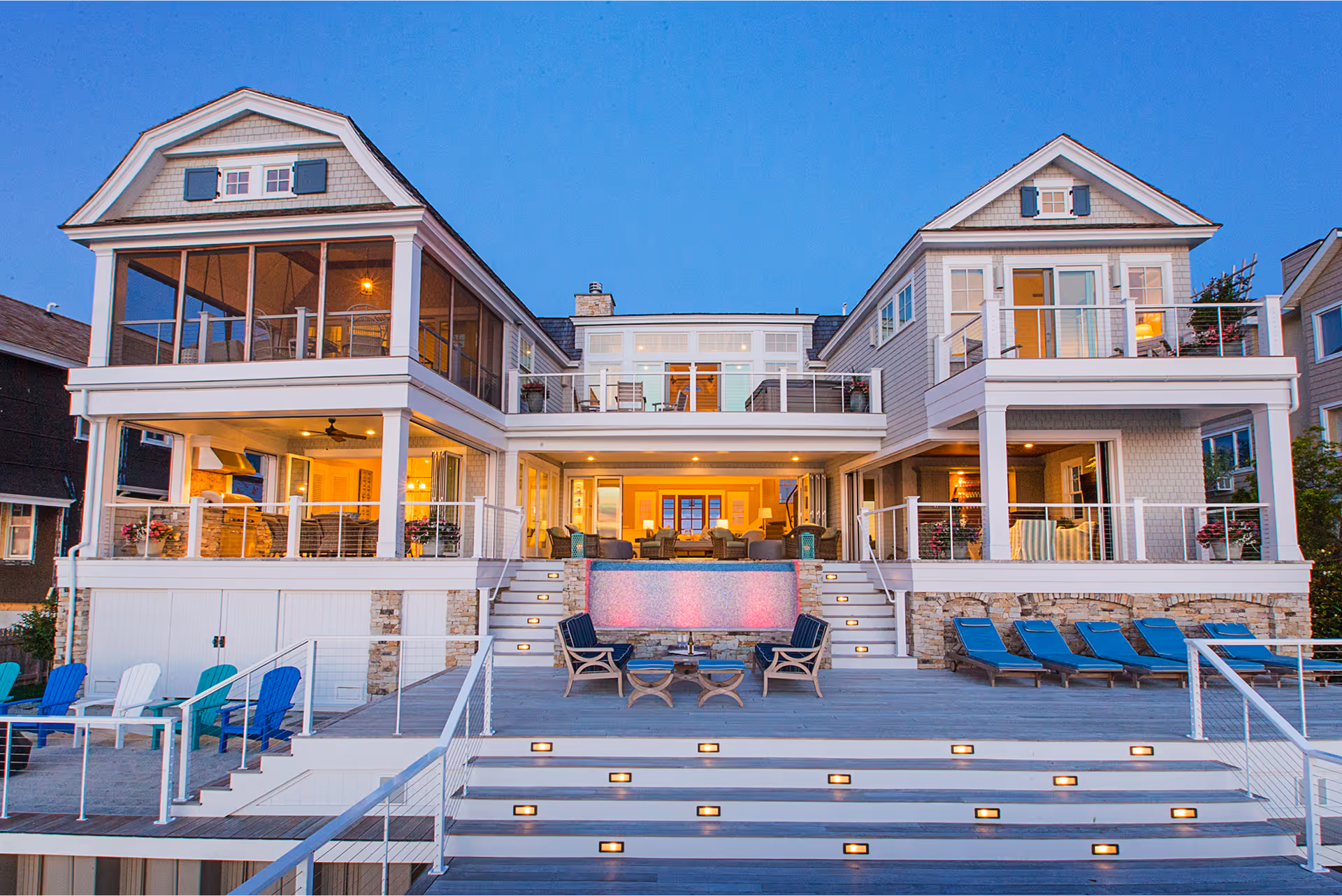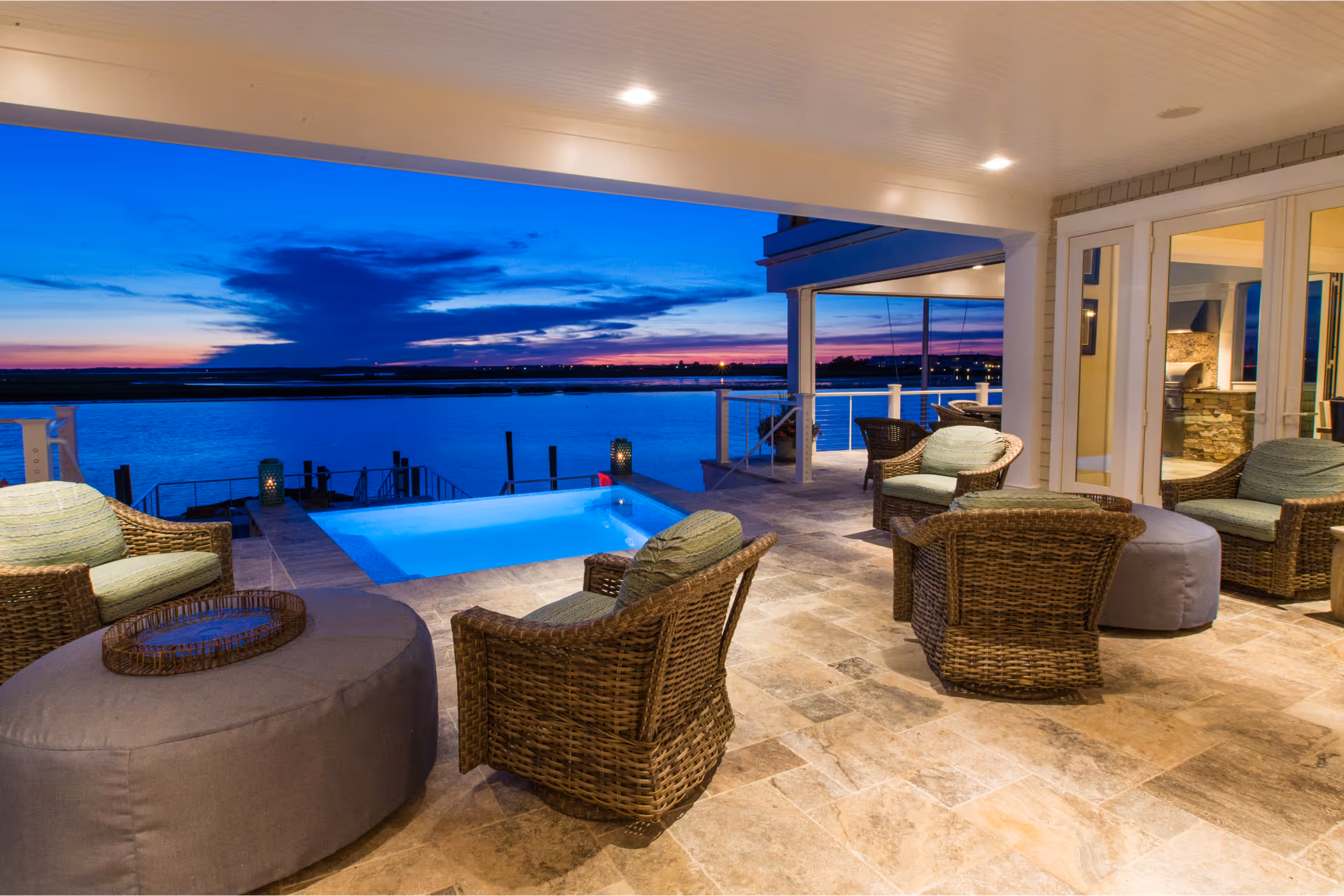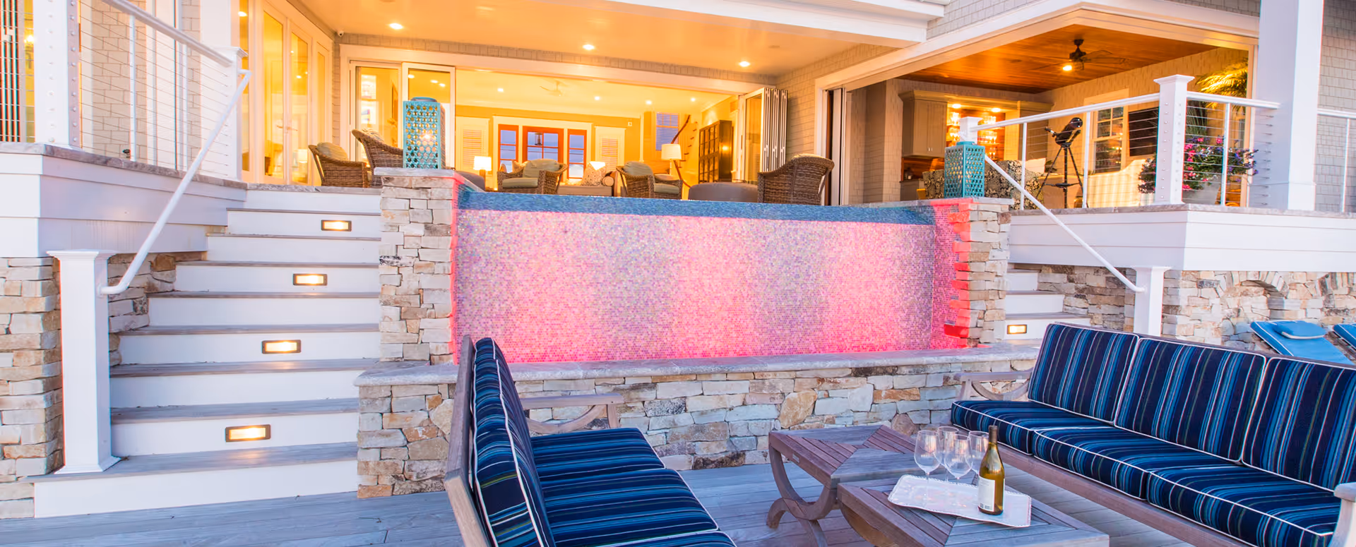 Perched above the coast, this design captures the artistry of light, water and form in a seamless composition. The vanishing-edge pool creates the illusion of water spilling into the horizon, while a surface of custom-blended glass tile refracts light with subtle brilliance throughout the day. As evening falls, integrated lighting transforms the water into a glowing sculpture – colors shifting across the glass mosaic to mirror the tones of sunset and nightfall.