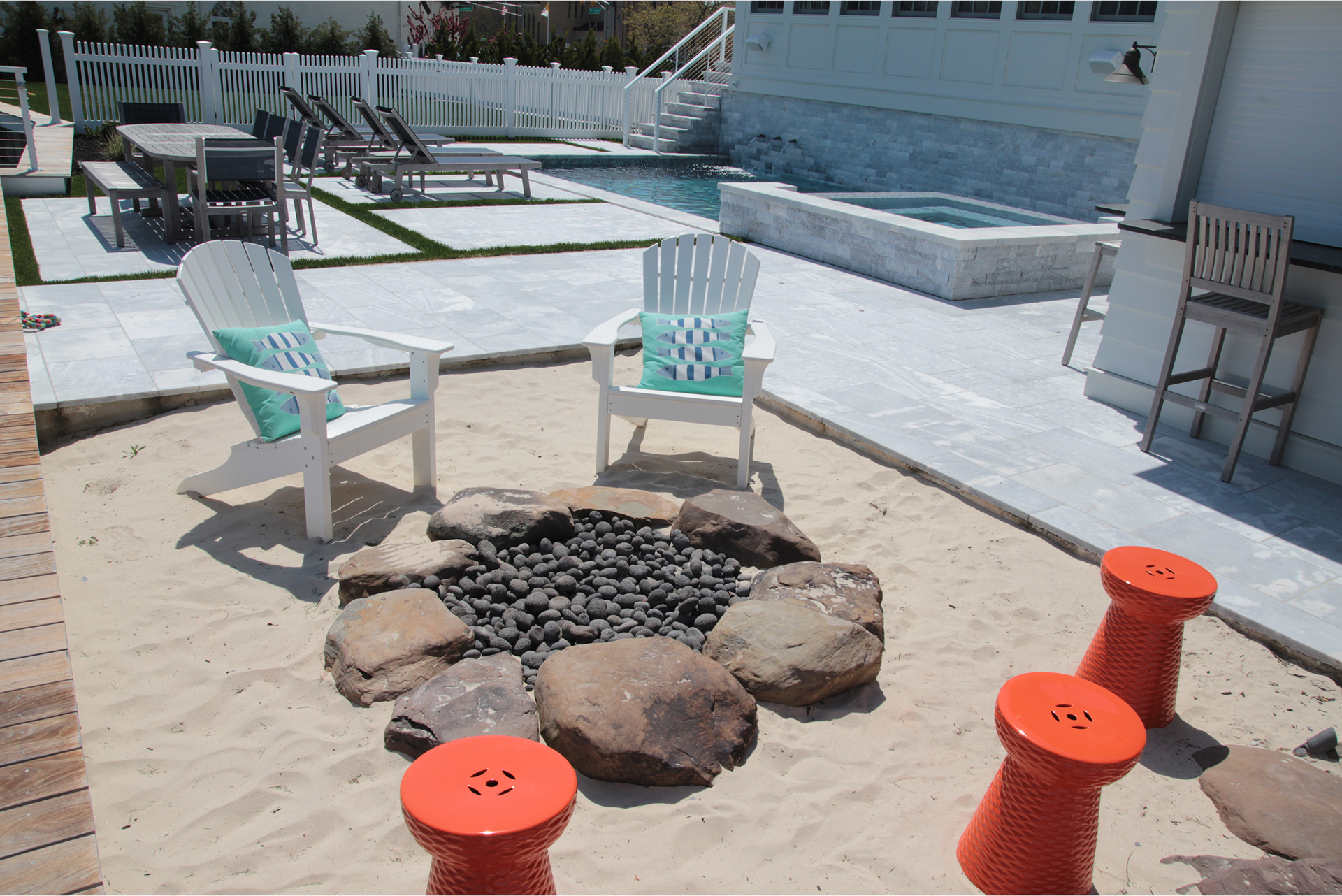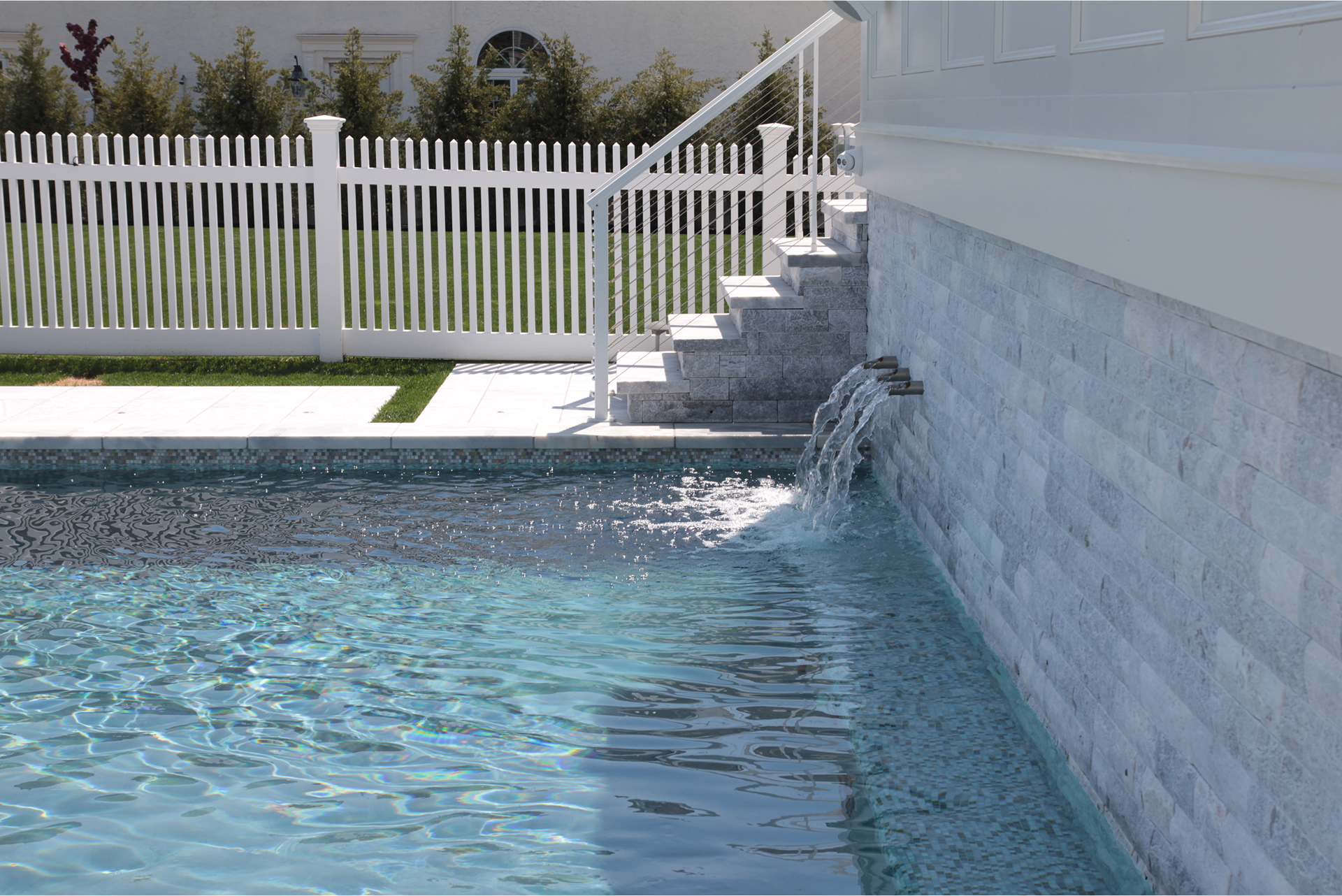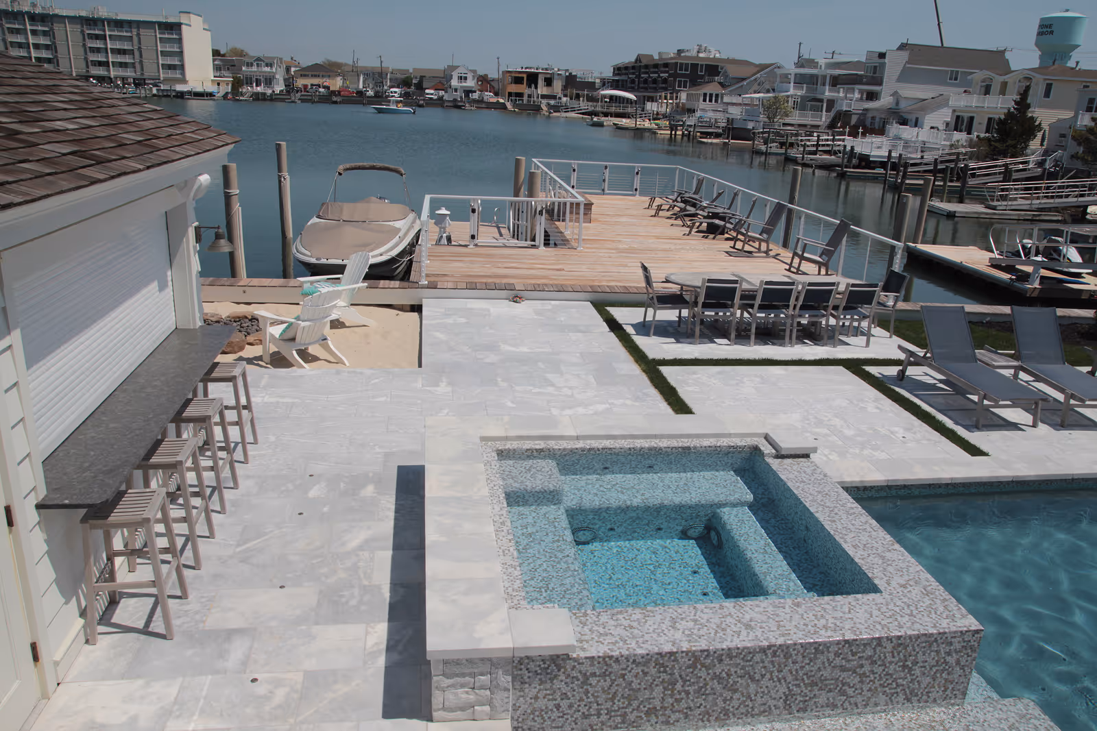 Sleek, sculptural, and quietly dramatic, this design offers a modern interpretation of coastal living. The pool’s unique placement—tucked elegantly beneath the home’s architecture—creates the illusion that water and structure exist as one continuous form. Along the far wall, precision-set scuppers release water into the pool below, introducing gentle movement and sound without disturbing the serene composition. At one corner, an understated raised spa provides a comfortable vantage point over the canal, blending function and luxury through meticulous craftsmanship. The surrounding segmented pad deck introduces a rhythm of masonry and turf, softening the geometry with texture and balance. A refined outdoor fire feature evokes the warmth of a beach bonfire, bringing light and energy to evening gatherings.