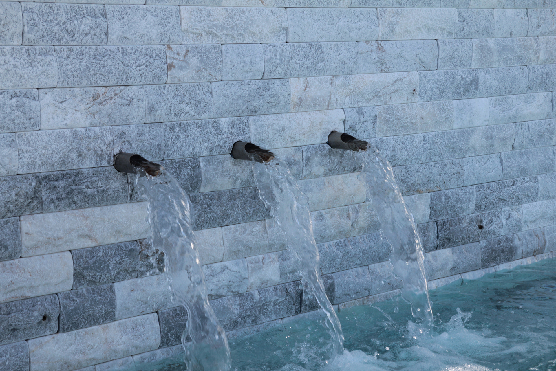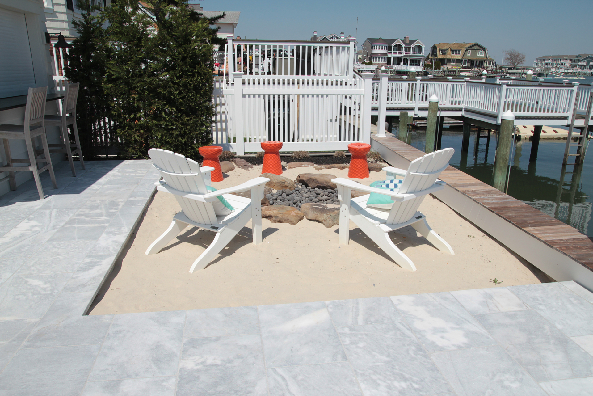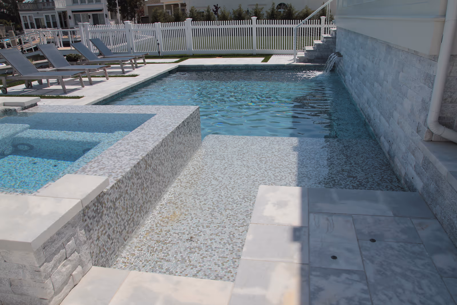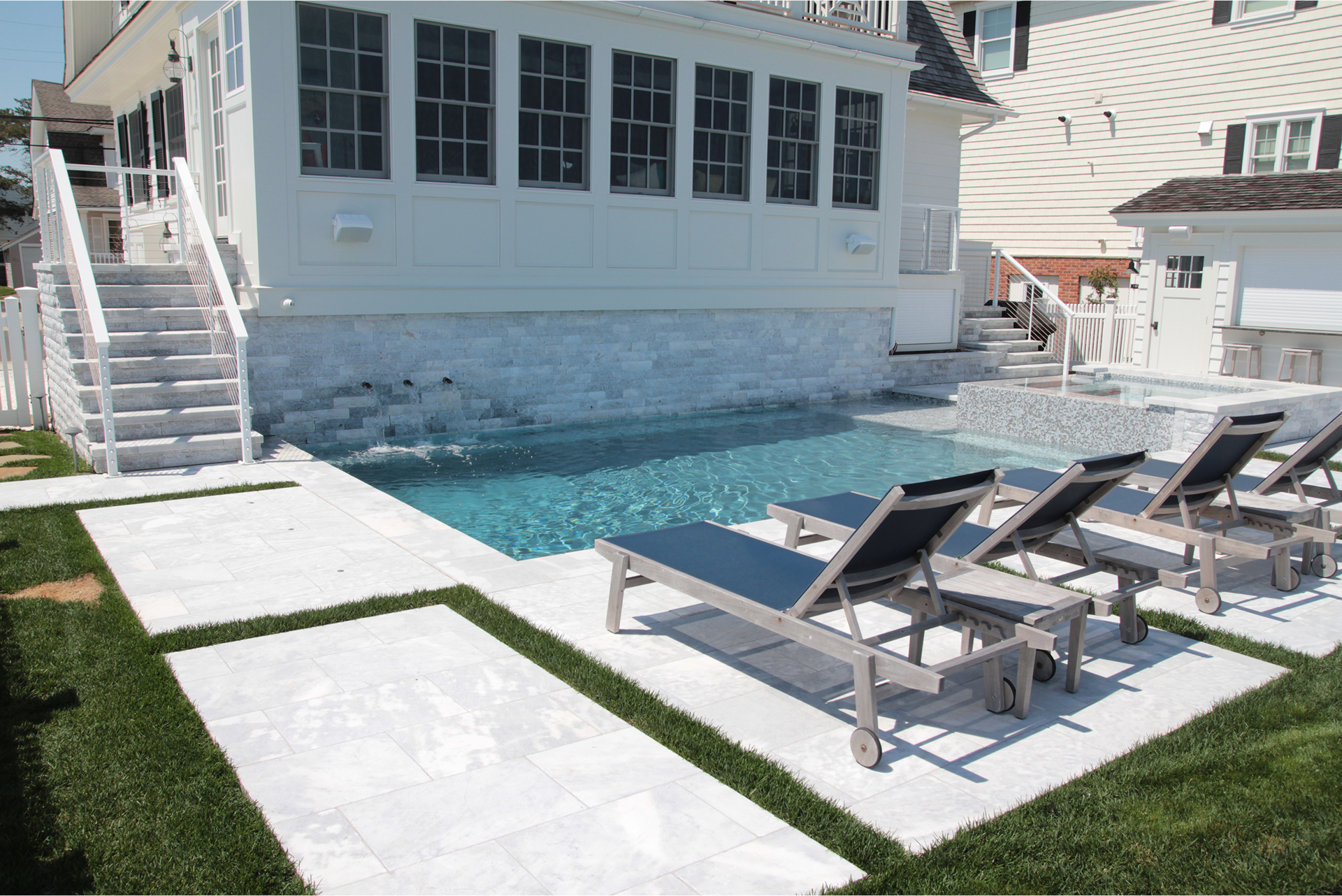 Sleek, sculptural, and quietly dramatic, this design offers a modern interpretation of coastal living. The pool’s unique placement—tucked elegantly beneath the home’s architecture—creates the illusion that water and structure exist as one continuous form. Along the far wall, precision-set scuppers release water into the pool below, introducing gentle movement and sound without disturbing the serene composition. At one corner, an understated raised spa provides a comfortable vantage point over the canal, blending function and luxury through meticulous craftsmanship. The surrounding segmented pad deck introduces a rhythm of masonry and turf, softening the geometry with texture and balance. A refined outdoor fire feature evokes the warmth of a beach bonfire, bringing light and energy to evening gatherings.