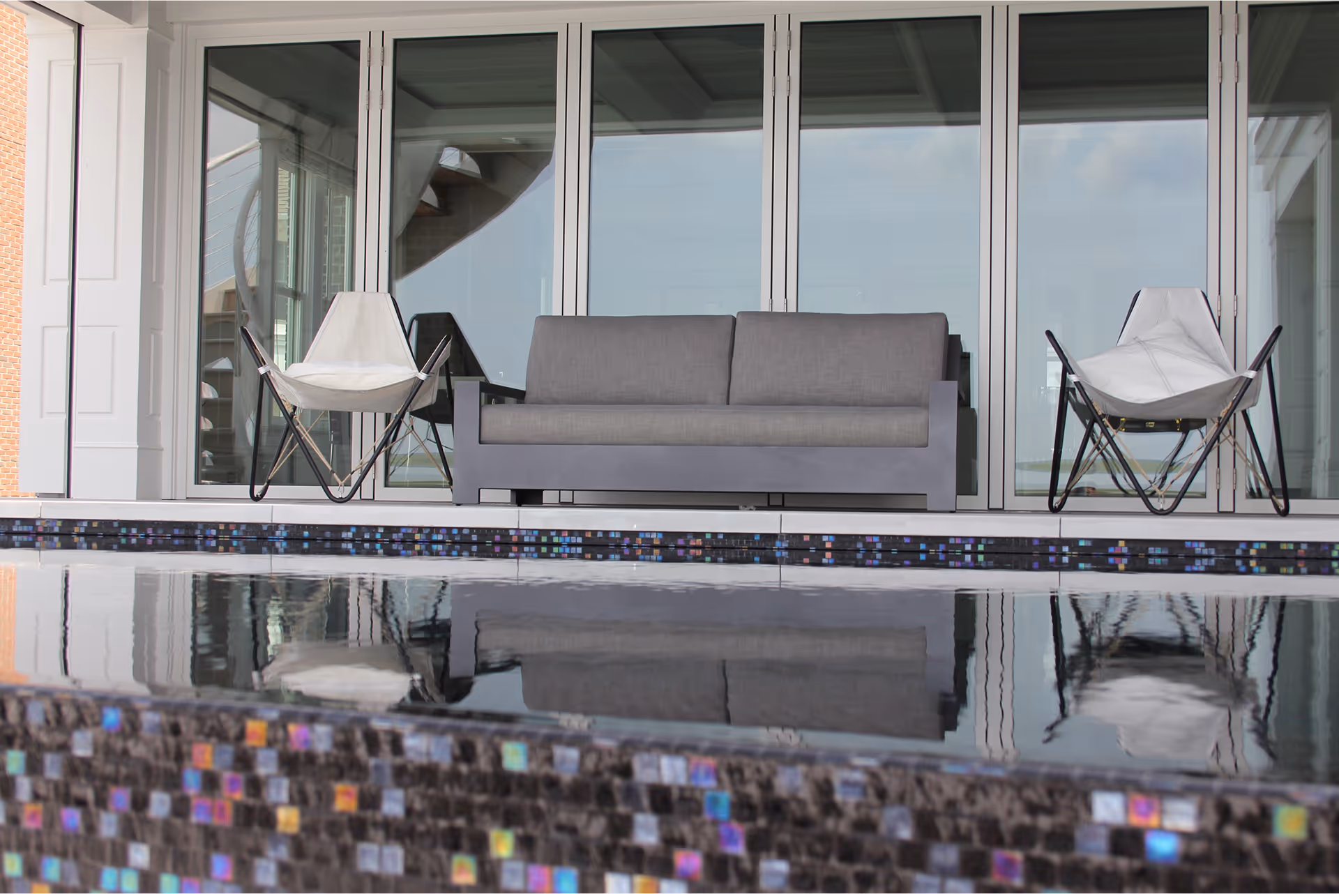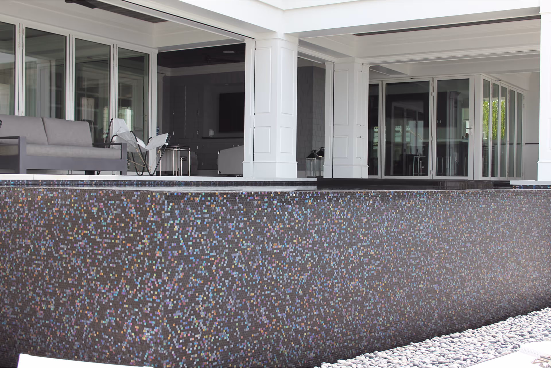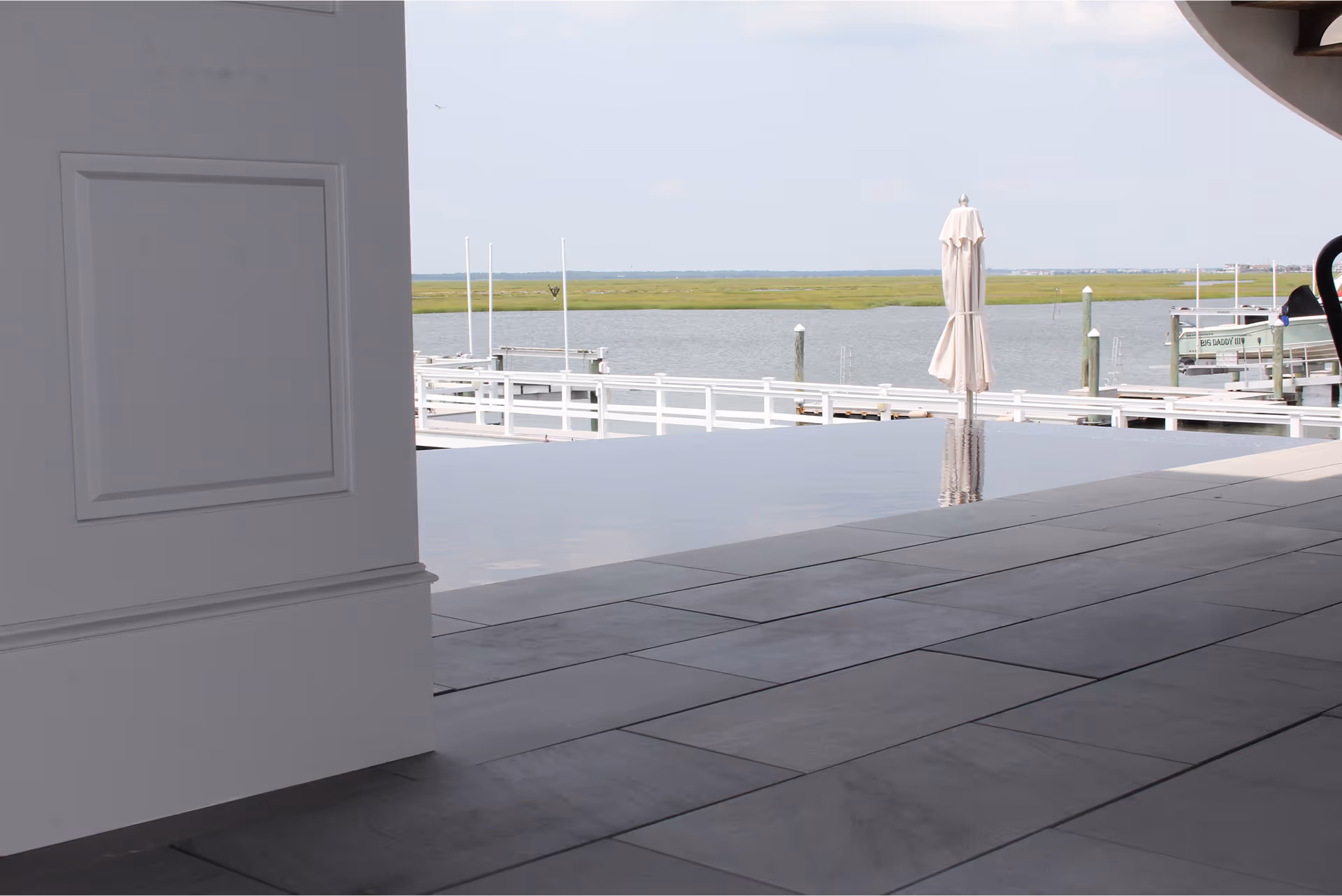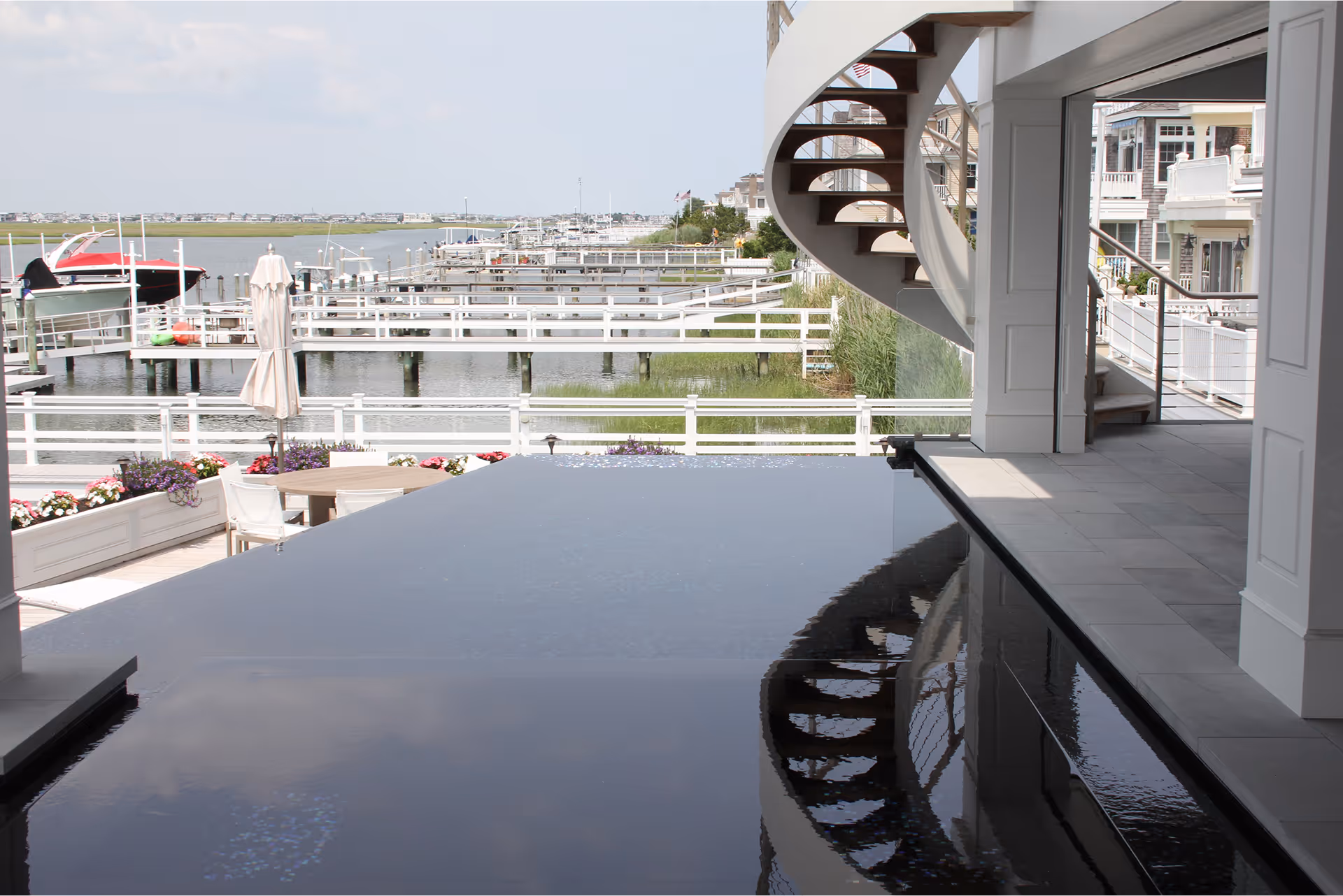 A study in contrast and light, this modern waterfront pool redefines sculptural precision. Clad entirely in a custom-blended black mosaic glass tile, the surface becomes a liquid mirror—capturing the graceful curve of the custom-built spiral staircase above. The vanishing edge draws the eye toward the horizon, merging pool and bay into one continuous plane. A raised spa rises like ice from the dark water, its sharp geometry softened by a seamless, polished finish. Designed with minimalist restraint, the composition transcends function—becoming a pure expression of art, architecture, and sensory design.